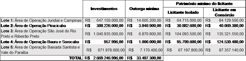 Todo o sistema que engloba viagens feitas entre os 645 municípios paulistas, inclusive com origem ou destino para a capital, será reformulado e modernizado, inclusive linhas de alta demanda como São Paulo/Santos, Bauru/Campinas e Jundiaí/São Paulo, por exemplo. Serão licitados cinco lotes pelo prazo de 15 anos no leilão marcado para o dia 15 março. O critério de seleção será pela maior oferta de outorga e o projeto elaborado pela Artesp estima taxa interna de retorno de 9,88%.