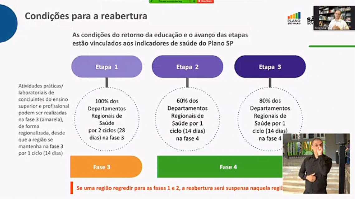 A proposta prevê rodízio de estudantes e uma combinação de aulas presenciais com manutenção do ensino à distância. Mas, As escolas só poderão ser reabertas quando todas as regiões do estado estiverem na fase "amarela" do plano de flexibilização da economia definido pelo estado.