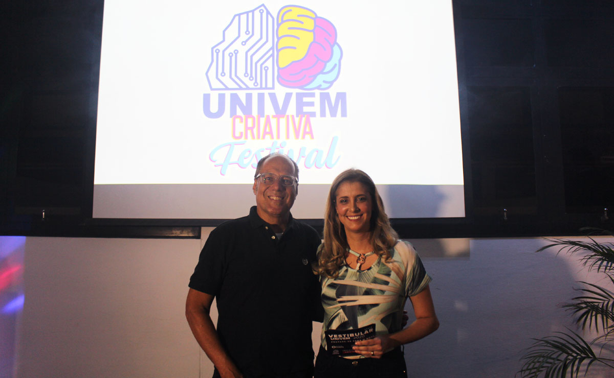 Prof.ª Roberta Brondani, coordenadora da Escola de Economia Criativa e o presidente da Federação Nacional de Agências de Propaganda, Alexis Pagliarini, durante o 1º UNIVEM Criativa Festival
