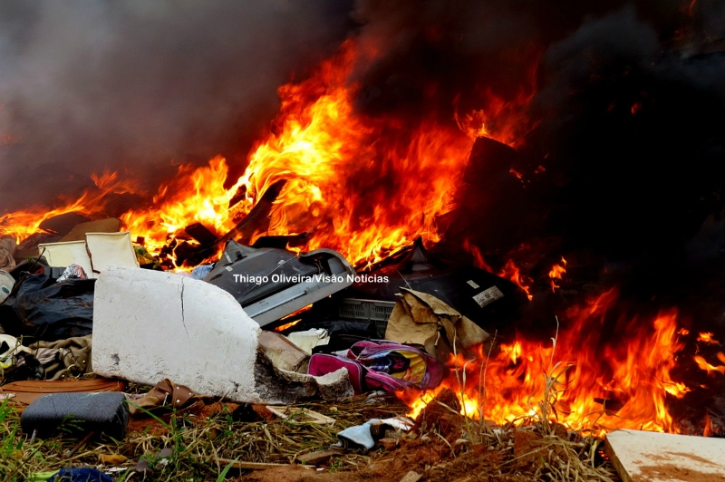 Um grande incêndio em entulhos e roupas foi registrado há pouco no distrito industrial, zona norte de Marília.