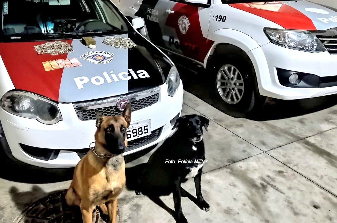 Com o auxílio dos cães farejadores, os policiais militares encontraram uma sacola azul contendo outras 156 porções de maconha e uma porção de crack. Já no quintal, foi localizado meio tijolo de maconha no meio de entulhos.