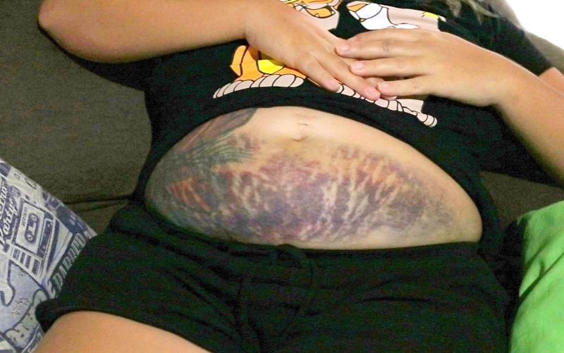 Mas, com o impacto da batida, o dispositivo acabou pressionando a parte baixa de sua barriga, que ficou vermelha logo em seguida.