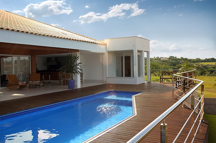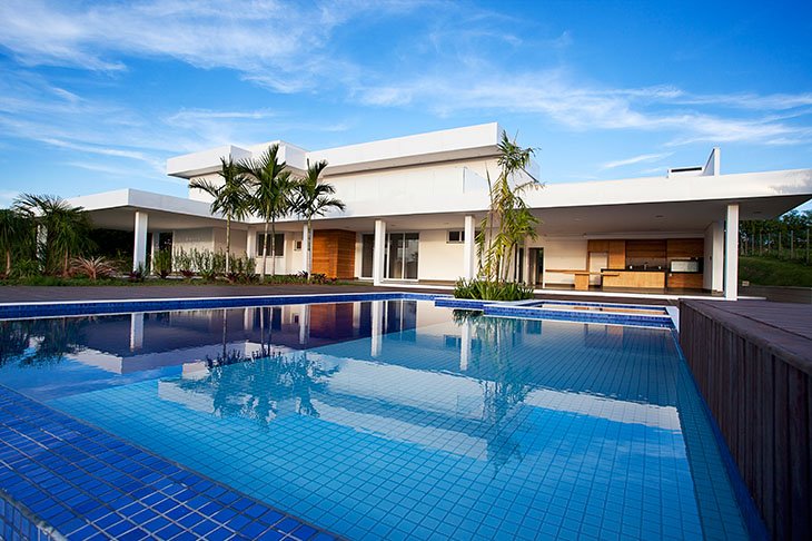 Horizontes - “A residência foi idealizada de forma a garantir funcionalidade e conforto aos usuários, além de aproveitar o terreno em declive pré-existente. Desta forma, os ambientes da residência estão implantados em duas cotas de níveis, com o acesso principal de pedestres na cota superior, assim como os demais cômodos, e o solário na cota inferior do terreno. A fim de contemplar a paisagem circundante em meio a uma extensa área de implantação, o projeto arquitetônico apresenta-se com traço leve e marcante, valorizando os espaços internos e externos, assim como a iluminação natural e ventilação. A residência construída no Green Valley decorre da intenção de aproveitar ao máximo a vista da paisagem e caracteriza-se por sua horizontalidade. A escolha de materiais e técnicas construtivas teve como eixo a contemporaneidade e a durabilidade.”
