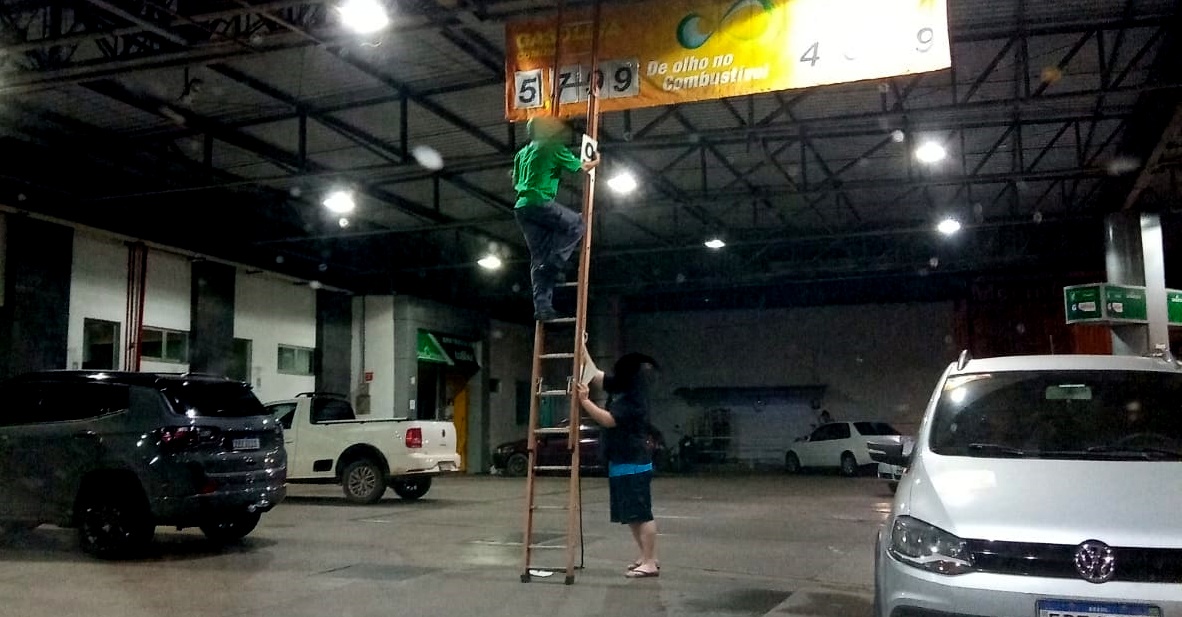 Funcionário estaria trocando, agora à noite a faixa, ou seja, reajustando o preço dos combustíveis.