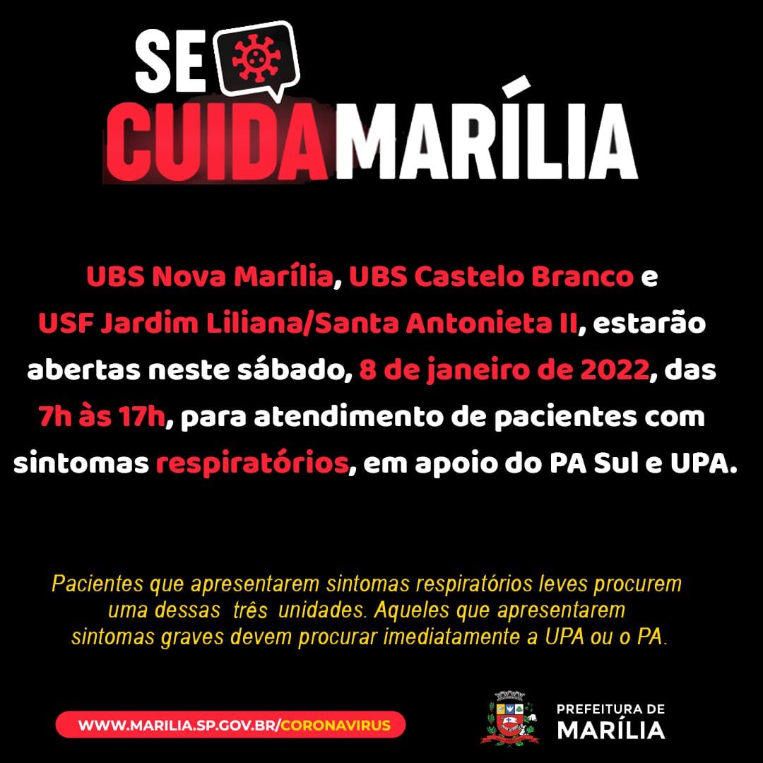 A Secretaria Municipal da Saúde de Marília informou que as três Unidades Sintomáticas (UBS Nova Marília, USF Jardim Liliana/ Santa Antonieta 2 e UBS Castelo Branco) estão funcionando neste sábado até às 17h, atendendo exclusivamente pacientes com quadro gripal.