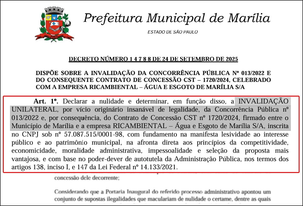 A Prefeitura de Marília publica no Diário Oficial do Município desta quinta-feira o decreto 14.788, que invalida o processo de concessão dos serviços de água e esgotamento sanitário com a empresa RIC Ambiental, vencedora do certame. A medida foi anunciada pelo prefeito Vinicius Camarinha durante entrevista coletiva nesta tarde. A medida emitiu uma nota oficial sobre essa medida do Executivo (veja abaixo).