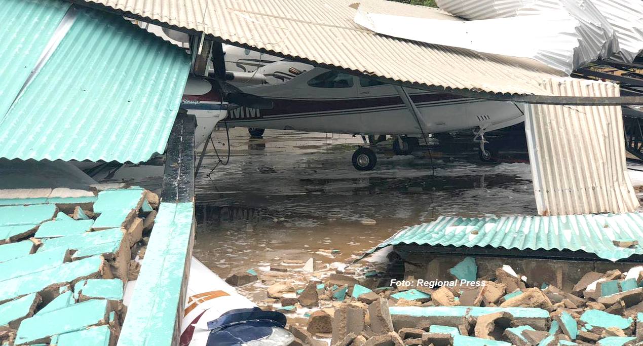 Com a força do vento, fios de alta tensão caíram e placas foram arremessadas para um matagal ao lado do aeroporto. O local do acidente foi isolado.