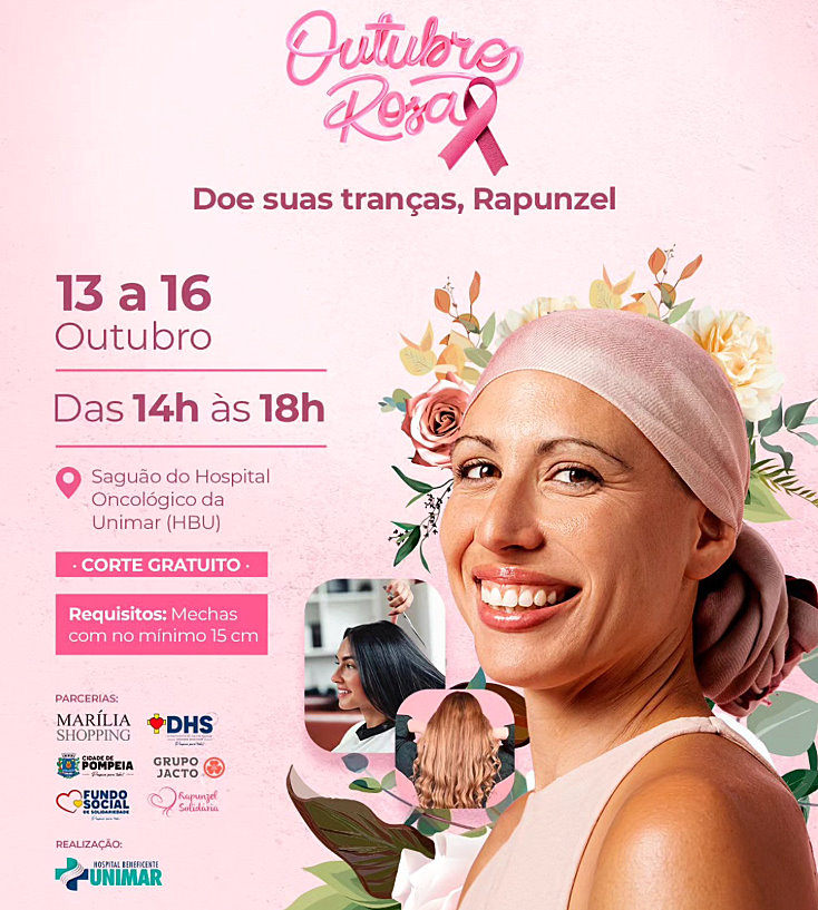 O Hospital Beneficente Unimar (HBU) está realizando de hoje até a próxima quinta-feira (dia 16) a campanha “Doe suas tranças, Rapunzel!”, voltada à arrecadação de mechas de cabelo para confecção de perucas, as quais serão destinadas a pacientes em tratamento de câncer de mama.