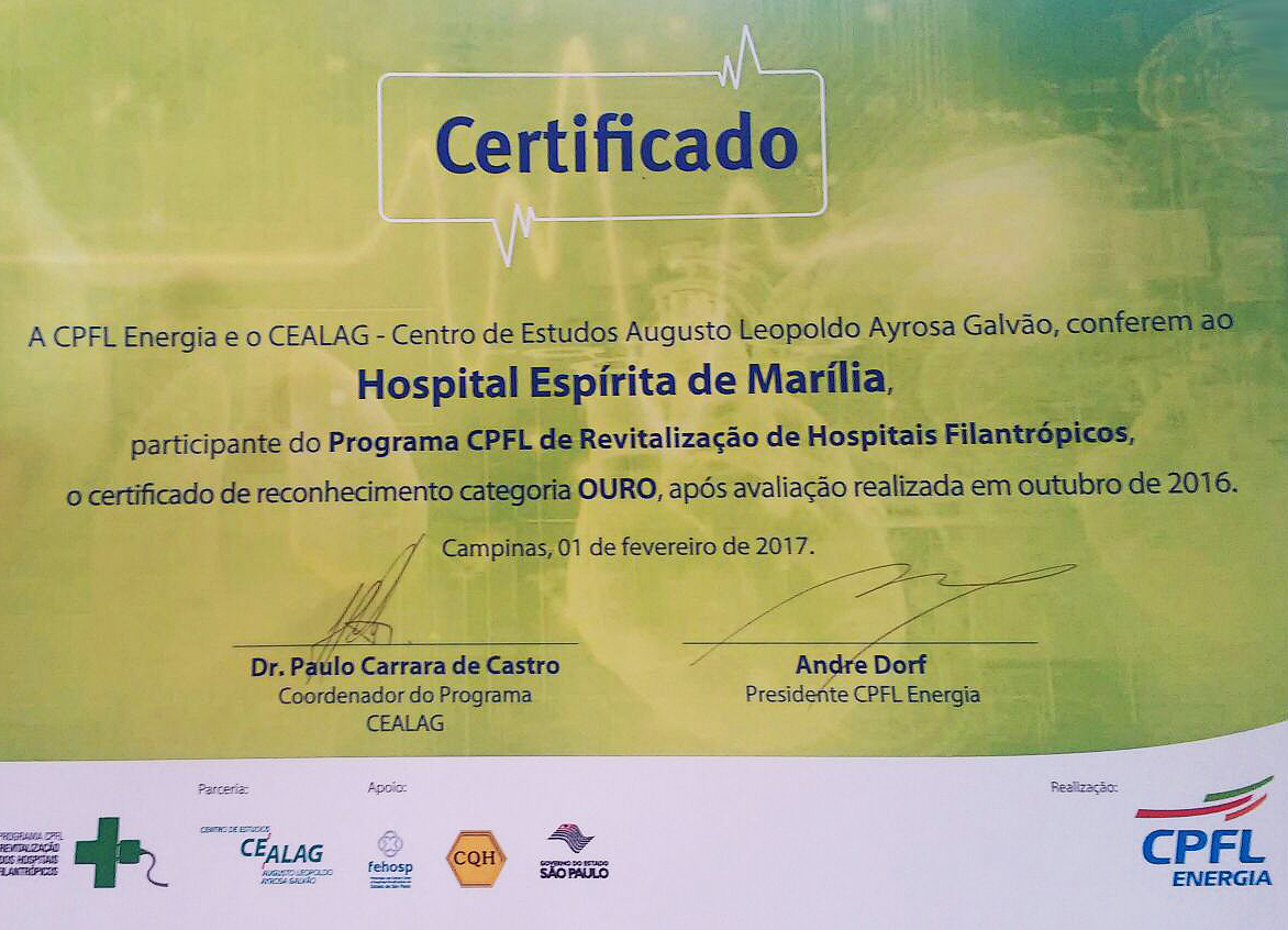 O Hospital Espírita de Marília (HEM) recebeu, nesta semana, o Certificado de Selo Ouro do Programa de Revitalização de Hospitais Filantrópicos, realizado pelo CEALAG