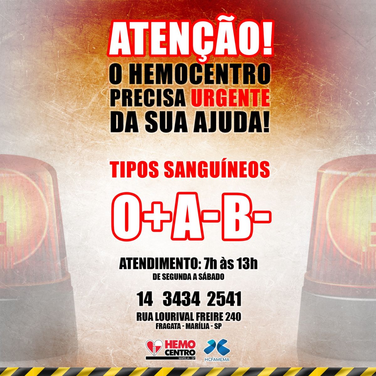O HC de Marília informa que o Hemocentro se encontra em situação emergencial para os tipos sanguíneos O-, só com 20,8% do estoque abastecido. Os tipos B- e AB- se encontram em estoque zero.