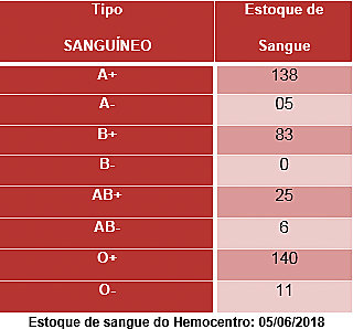 O quadro mais alarmante no estoque é o do tipo B negativo que está zerado. Entre os tipos com estoques insuficientes também estão o A negativo, AB negativo e O negativo. O objetivo da equipe é manter a estabilidade dos estoques sanguíneos.