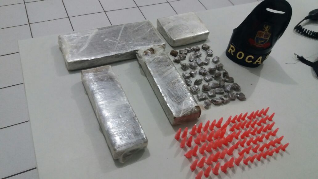 Tentando escapar ele abandonou a própria esposa e a moto no local e fugiu em direção à rodovia do Contorno com uma mochila nas costas. A mulher relatou aos PMs o provável endereço para qual ele fugia e minutos depois, no telhado do imóvel, ele acabou preso. Após muita busca os policiais conseguiram encontrar em um matagal a mochila que o fujão carregava, contendo 4kg de maconha, porções fracionadas da erva prontas para venda e 79 pinos de cocaína.