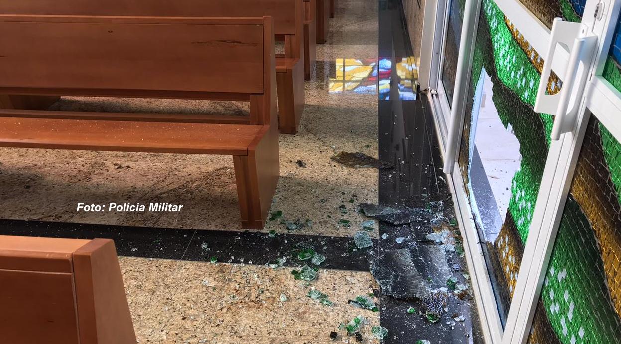 O criminoso arrombou os vidros laterais da igreja para furtar a TV.