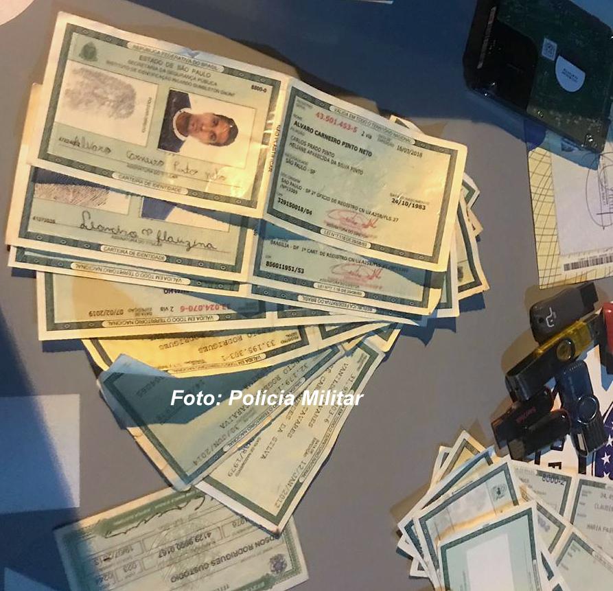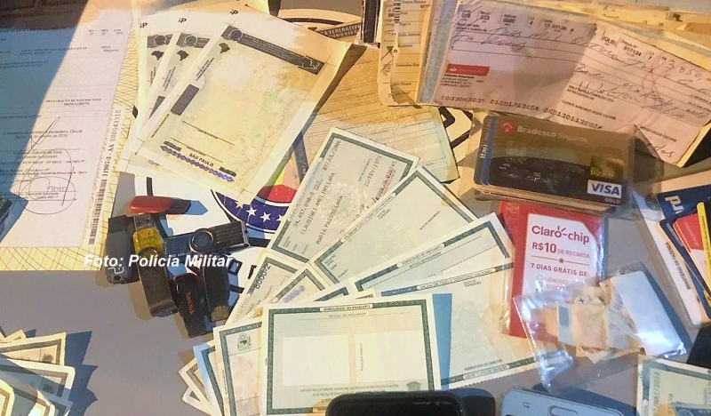 A PM foi até o local com ele, e lá localizaram cerca de oito mil reais, cinco certidões de nascimentos falsas, outros RGs falsos e diversos cheques em nome de outras pessoas.