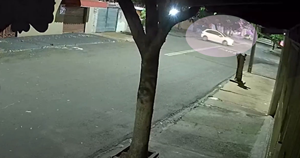 Câmera de segurança registra o momento em que o ex-marido chega com o carro e efetua os disparos contra as vítimas.