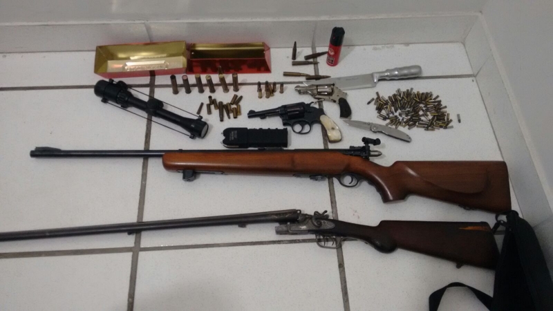 Mas, ao vistoriar o veículo, os policiais encontraram duas espingardas, o revólver calibre 38 (que efetuou os disparos) bem como várias munições (inclusive de fuzil 762 - de uso restrito), luneta, gás de pimenta, faca e um canivete.