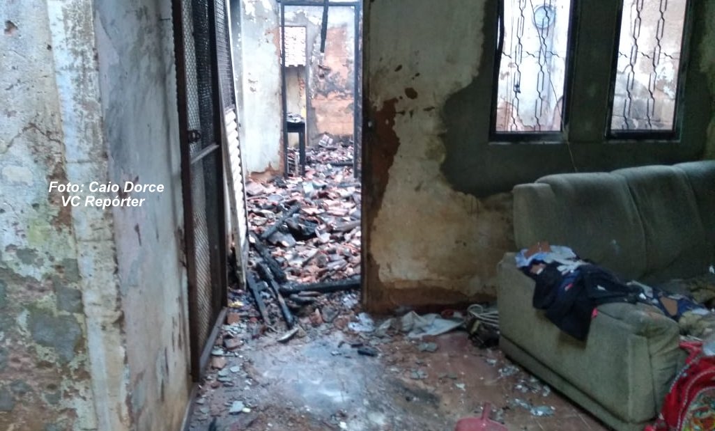 A casa ficou praticamente destruída pelo fogo. Dono suspeita de incêndio criminoso