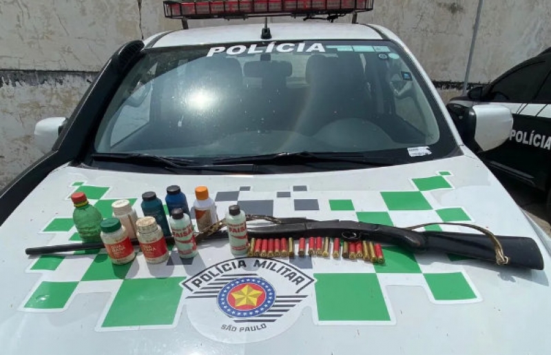 Uma espingarda calibre 32, carregada com um cartucho intacto, e sem registro, foi encontrada debaixo da cama do suspeito. Houve ainda apreensão de 18 cartuchos, dois fracos contendo chumbos, 73 espoletas e um socador de pólvora.