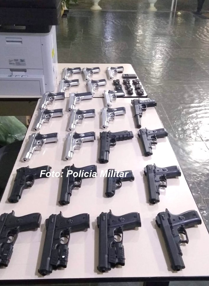 O motorista apresentava sinais de uso de drogas. Na vistoria, foram localizadas as 24 réplicas de arma de fogo além de uma uma máquina de cartão foram apreendidos.