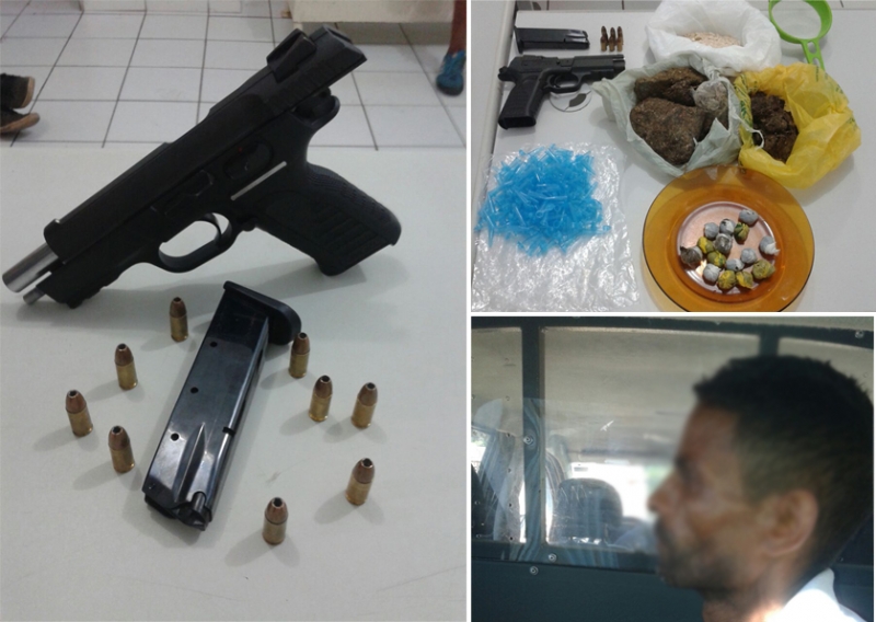 Em revista no imóvel os policiais localizaram ainda uma grande quantidade de maconha, cocaína e materiais para embalagem das drogas. Lúcio da Conceição recebeu voz de prisão em flagrante por porte de arma de foto de calibre restrito e tráfico de drogas.