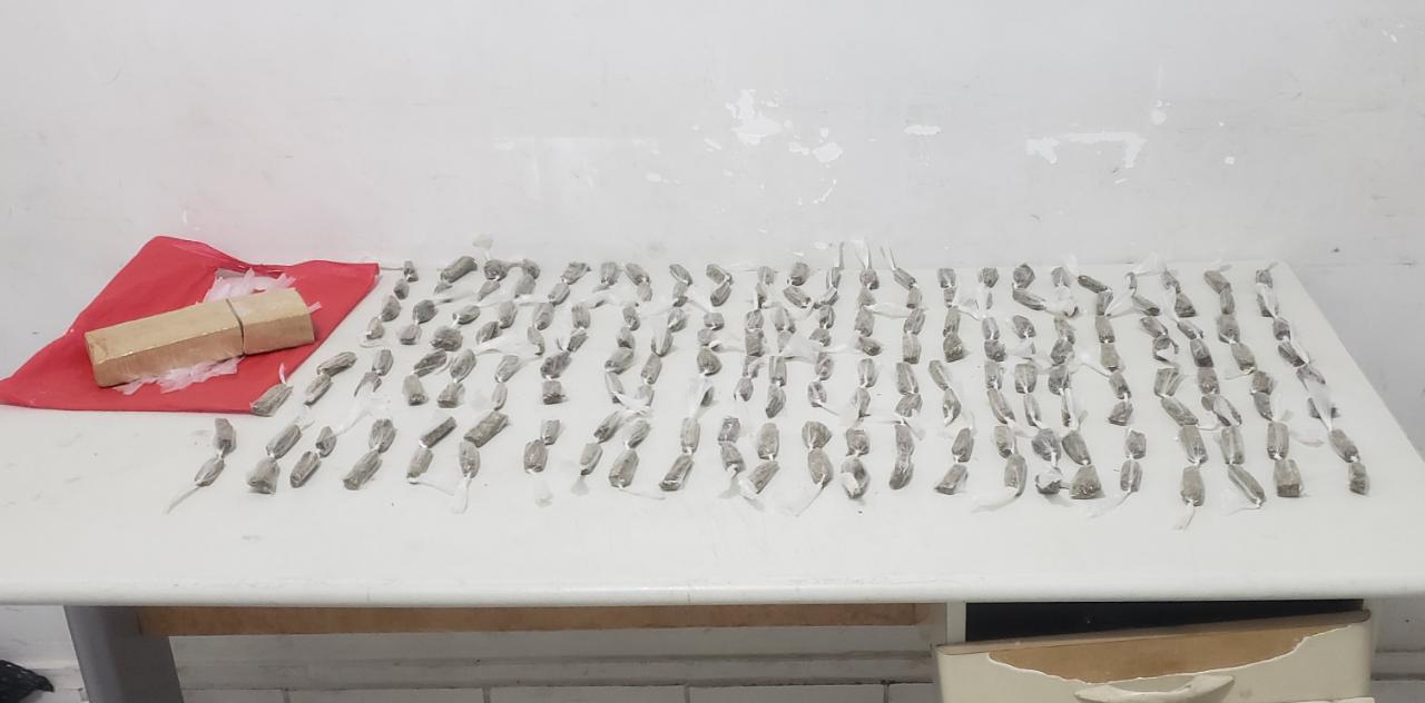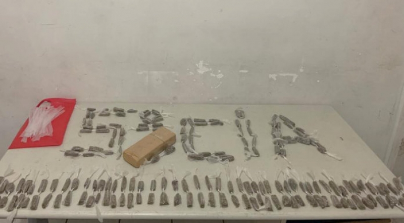 Por volta de 17h, os policiais militares que patrulhavam o bairro desconfiaram de um suspeito que pendurou numa árvore uma sacola e na mesma continha 187 porções de maconha. Ao ser abordado ele afirmou que a droga seria entregue para menores realizarem a venda. Já o tablete teria a mesma destinação após ser fracionado.