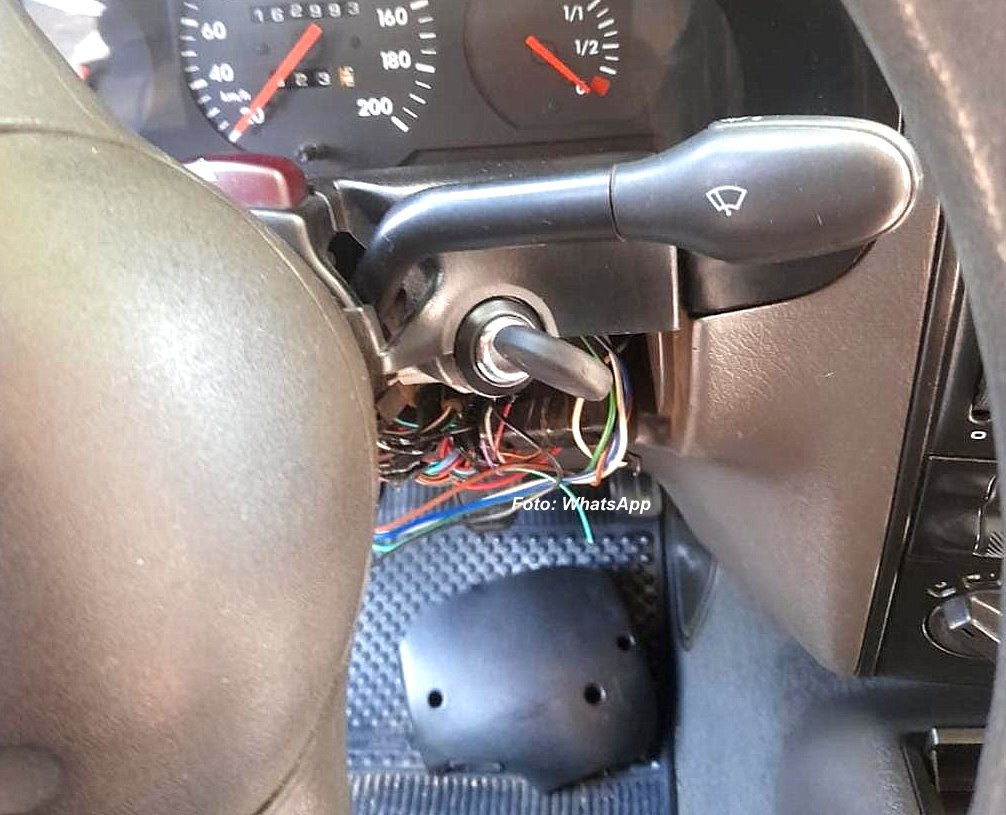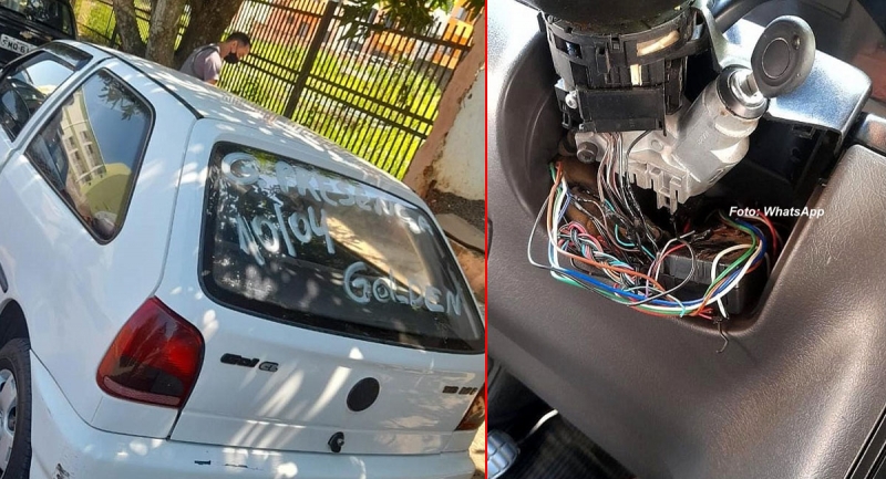 O veículo estava com as portas abertas, com os fios do painel cortados e uma chave micha no contato.