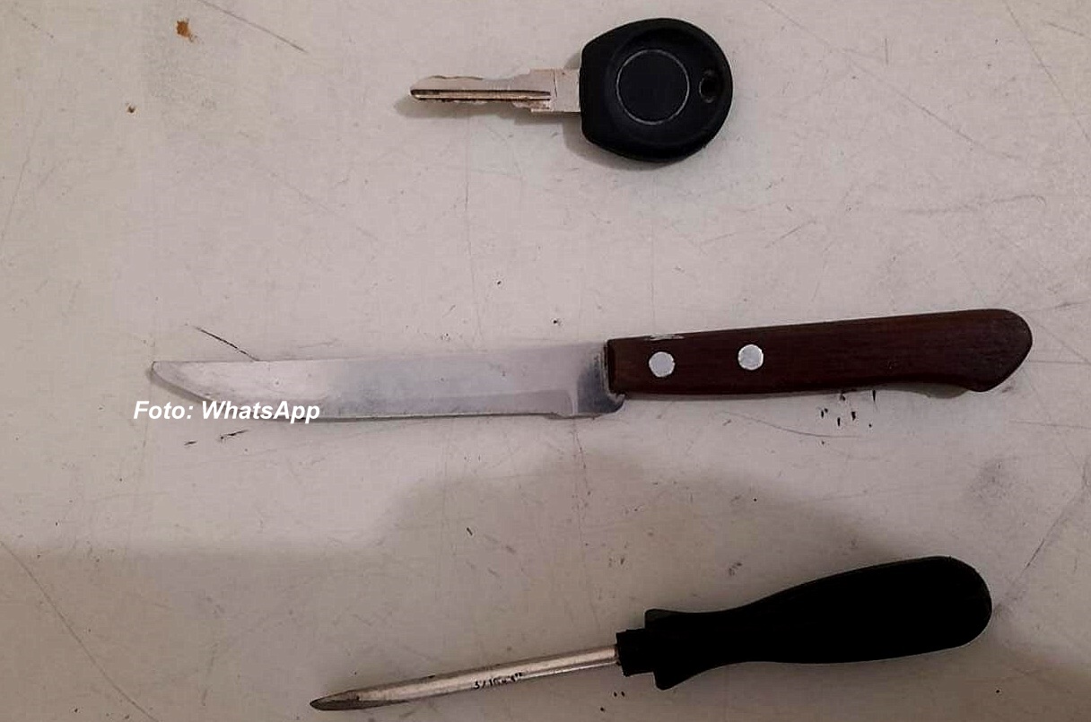 Foi encontrado com ele uma faca e uma chave de fenda pequenas (foto).
