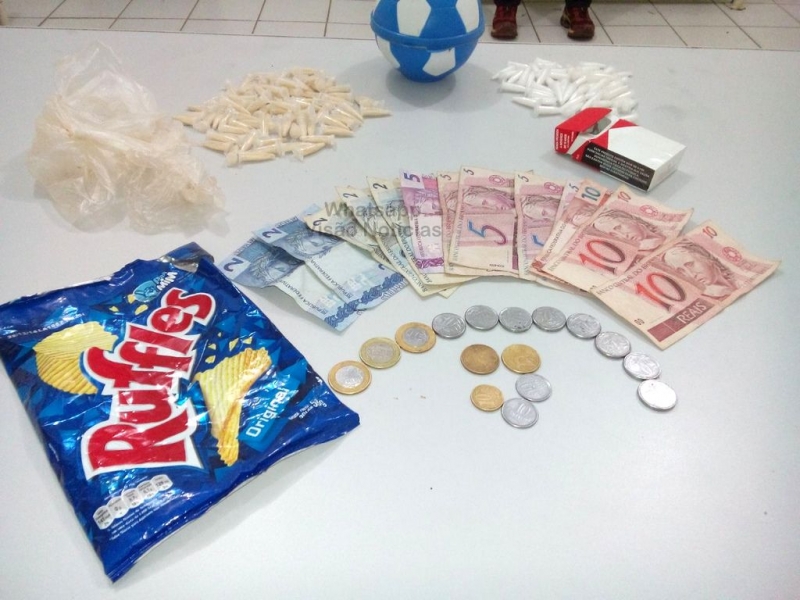 Com ele, um pacote de batata chips foi encontrado. No interior do pacote de batatas, estavam R$ 65 em notas diversas. Questionado, ele informou que o dinheiro seria de um bico de garçom.