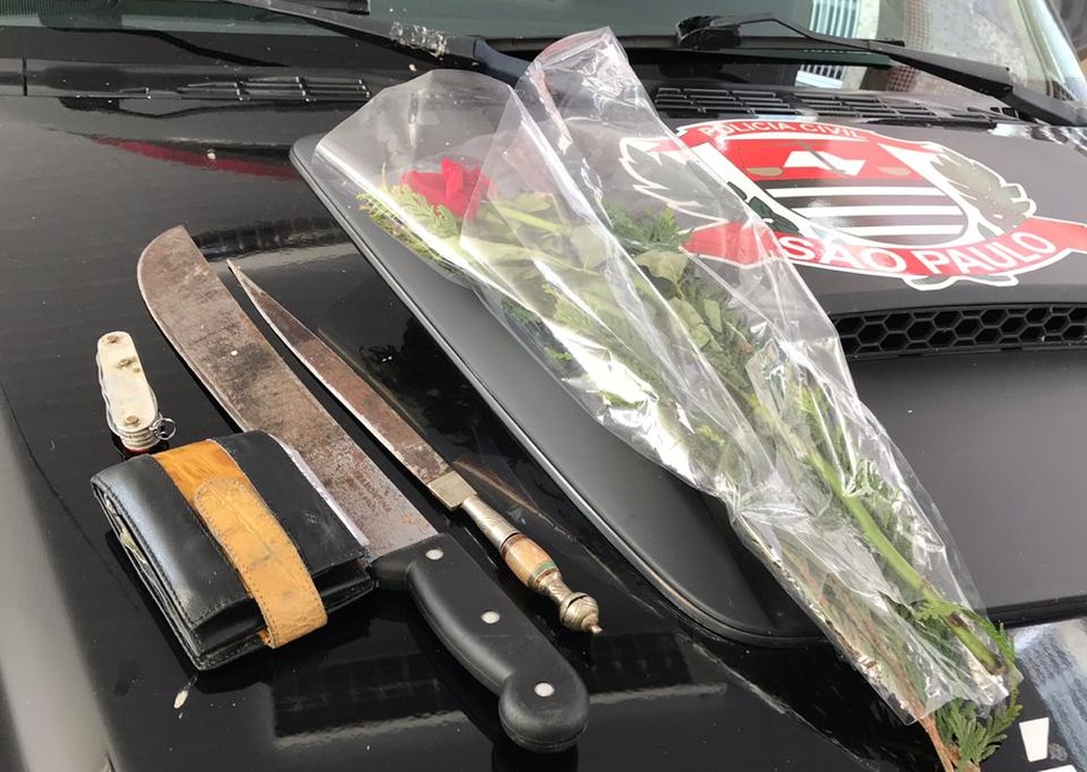 Assim que receber alta, o suspeito deverá ser encaminhado para uma penitenciária da região por descumprir a medida protetiva, e ficará à disposição da Justiça. O buquê, a faca e o canivete foram apreendidos pela Polícia Civil. Fonte: G-1. Fotos: divulgação/Polícia Civil.