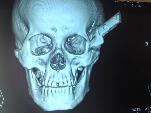 Faca atravessou o olho direito e ainda atingiu o maxilar inferior.