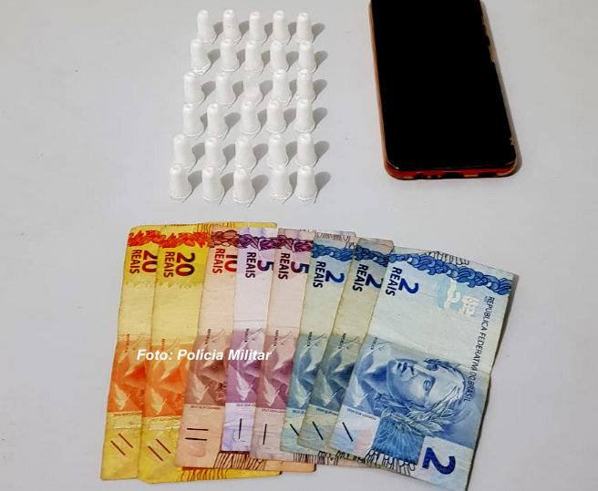 Ele também portava um saco plástico transparente, onde estavam guardados 30 microtubos contendo cocaína, R$66,00 em notas diversas e um aparelho celular.