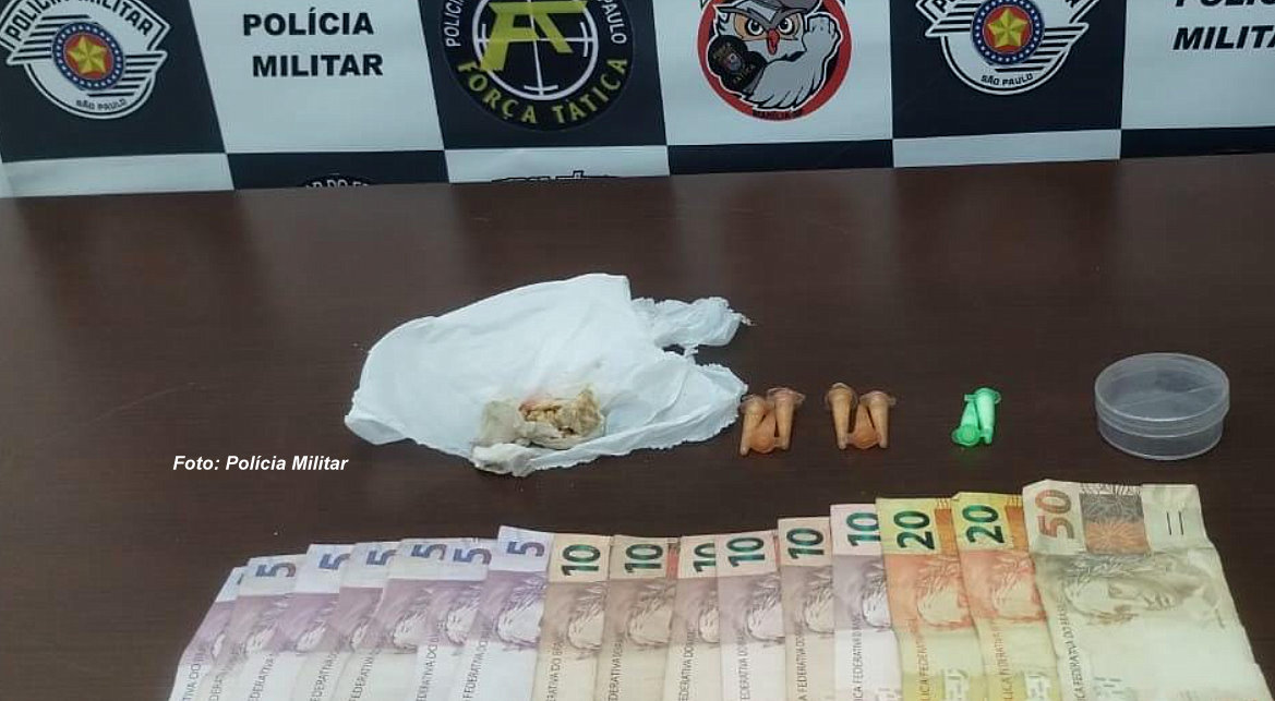 Um deles, ao perceber que seria abordado, simplesmente colocou um saco plástico na boca. Os PMs constaram que eram pedras de crack e também foi localizado próximo ao banco onde estavam sentados um pote plástico com seis pinos de crack e dois pinos de cocaína.