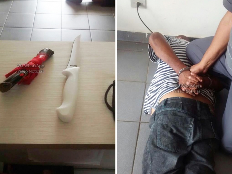 Para o susto de todos, o indivíduo invadiu a unidade policial com outra faca, com quase 30cm de comprimento, e tentou apunhalar tanto a mulher quanto os PM's. Utilizando da força moderada, os Cabos Carlos Augusto e Djalma conseguiram prender o indivíduo, evitando que alguém fosse ferido. Ele disse que teria comprado a faca minutos antes, com o intúito de matar a mulher.