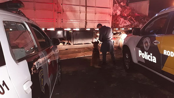 Policiais estavam na base operacional quando abordaram um caminhão Scania, com placas de Ponta Porã (MS), que transportava sucatas. Ao ser parado o motorista demonstrou nervosismo e após buscas com o apoio do Canil e com auxilio de um cão farejador foi localizado 134 tabletes da droga em meio as sucatas em um fundo falso. Foi pesado ao todo, 140,715 quilos de pasta base de cocaina.