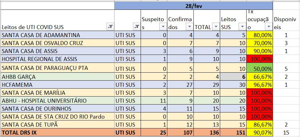 Marília possui um total de 60 leitos de UTI/SUS e, neste domingo, 59 deles estavam ocupados por pacientes em condições graves de saúde por causa da Covid-19.
