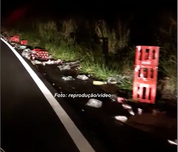 Boa parte da carga ficou espalhada pela pista e acostamento.