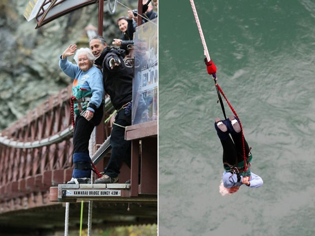 A vovó aventureira se chama Mary Manssen e saltou de 43 metros de altura da ponte Kawarau, em Queenstown.