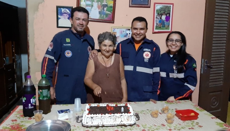 A idosa Francisca Maria Barros completou 63 anos e ganhou uma festa surpresa. E a surpresa foi tanta que ela passou mal, desmaiou e precisou ser socorrida pelos profissionais do Serviço de Atendimento Móvel de Urgência de Parnaíba, litoral do Piauí. Felizmente, depois do susto, Francisca se recuperou e cantou parabéns ao lado dos socorristas que a ajudaram.