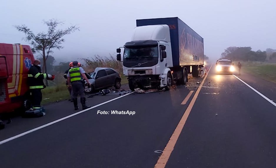 Um idoso de 75 anos morreu após o carro em que estava bater de frente com um caminhão na rodovia SP-421, em Oscar Bressane, por volta das 6h deste sábado.