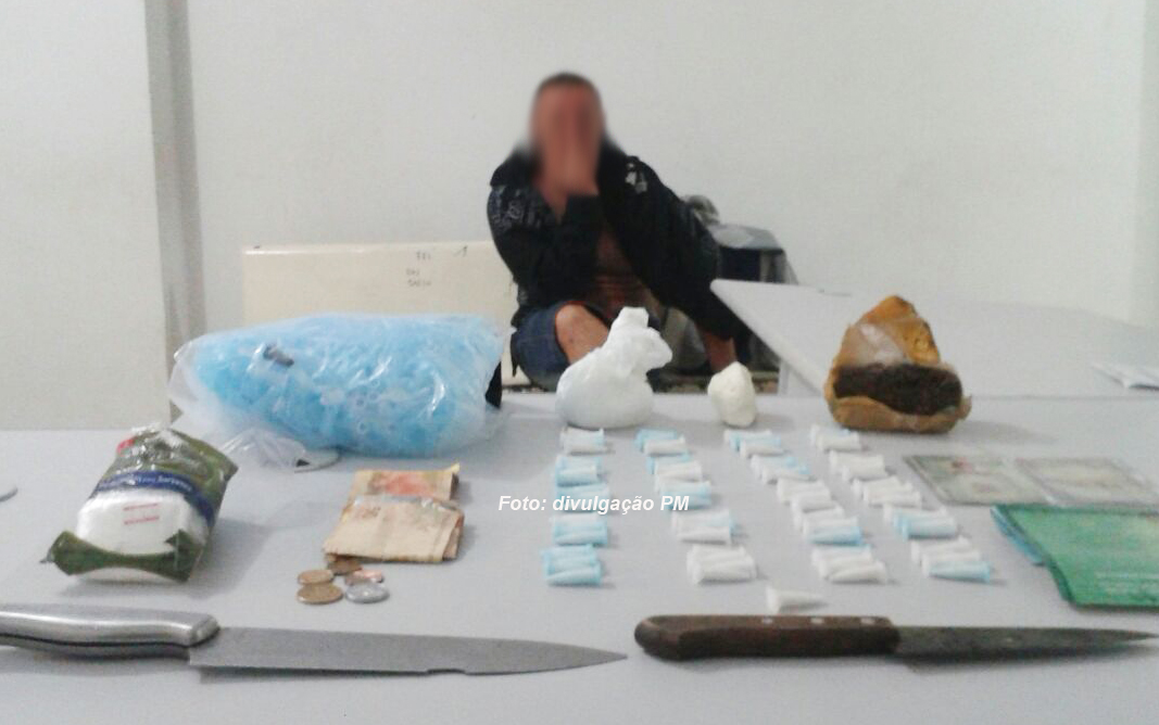 Suspeitando se tratar de tráfico, os policiais foram até ao local e flagraram um garoto com a camiseta do Barcelona no meio da via pública e, ao avistar a viatura, tentou fugir. Ele foi detido e, em seus bolsos, foram encontrados R$ 50,00 e cinco microtúbulos contendo cocaína. Imediatamente foram até a Kombi onde prenderam o homem com aproximadamente 70,00 reais em cédulas, 101 microtúbulos de cocaína, uma pedra de cocaína, uma sacola plástica com pó branco de cocaína, uma peça de maconha e duas facas com vestígios de maconha e cocaína.