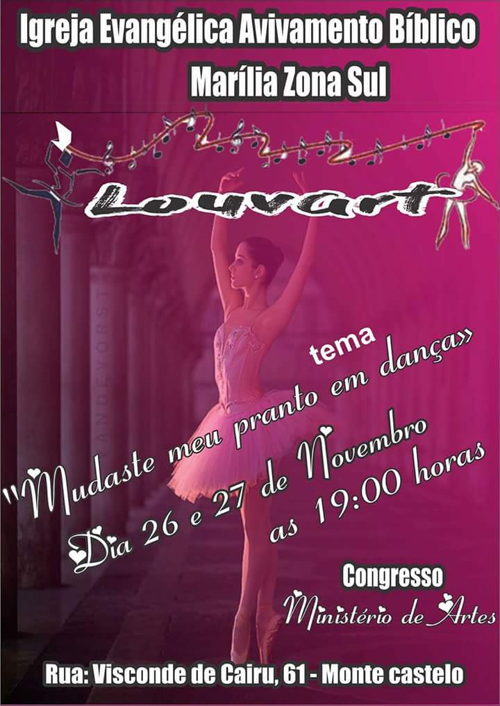 Para o congresso do ministério de artes Louvart estarão participando vários grupos de dança da cidade e região. Trata-se de um evento anual e que [é realizado há mais de 10 anos, com o objetivo de levar a palavra de Deus às pessoas, através de um evento de dança.
