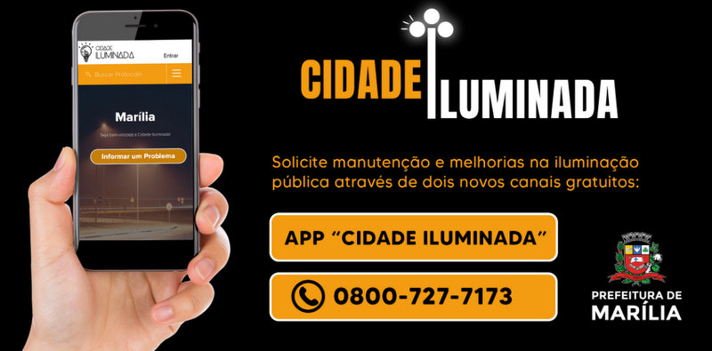Trata-se do App “Cidade Iluminada” e o telefone 0800-727-7173, que já estão disponíveis ao cidadão mariliense, recebendo pedidos relacionados à iluminação pública da cidade, informou o prefeito Daniel Alonso.
