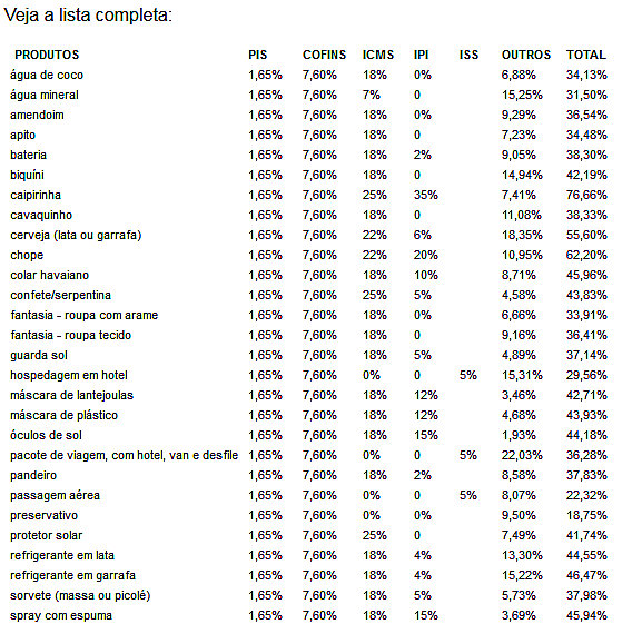 Para os foliões mais animados, o preservativo é o produto sobre o qual menos incide tributos: “apenas” 18,75%, sendo que 1,65% refere-se ao PIS, 7,60% à COFINS, curiosamente nada de ICMS e nada de IPI. Os 9,50% restantes são destinados a outras taxações.