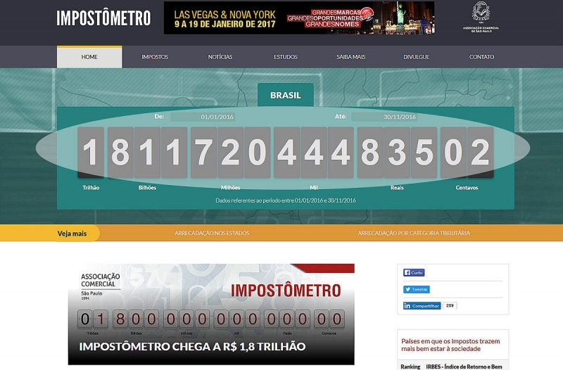 O Impostômetro da Associação Comercial de São Paulo (ACSP) superou nesta semana a marca de R$ 1,8 trilhão. O montante representa o total de impostos, taxas e contribuições que o brasileiro pagou desde o início do ano. Em 2015, esse mesmo montante foi arrecado exatamente neste dia 30 de novembro.