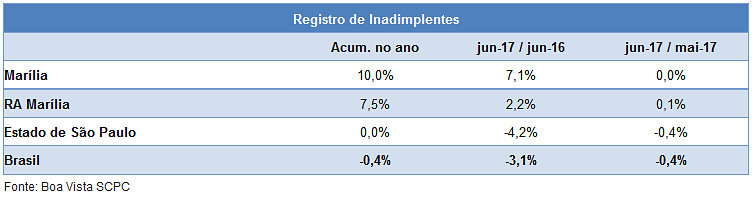 No valor interanual, a inadimplência em Marília avançou 7,1%, enquanto nos dados mensais de junho contra o mês anterior o índice manteve estabilidade (0,0%); na região, houve crescimento de de 7,5%. Já no Estado de São Paulo foi estável e, à nível nacional, queda de 0,4%.