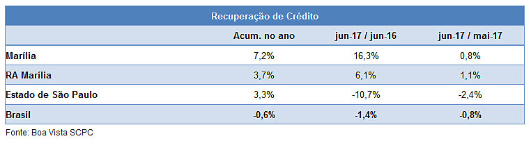 Em Marília, a inadimplência do consumidor subiu 10,0% nos valores acumulados no ano até junho. Já a recuperação de crédito do consumidor, por sua vez, aumentou 7,2% nos valores acumulados no ano até junho, sendo bem acima das médias regional, do Estado e do país.