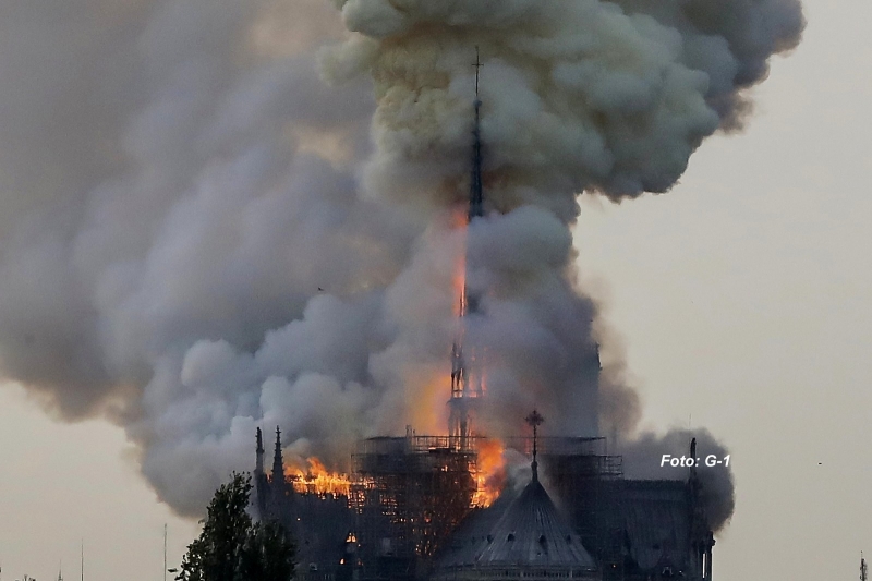 Por volta das 14h55 (horário de Brasília), repórteres do periódico Le Parisien confirmaram que a torre principal da construção tombou em decorrência das chamas.