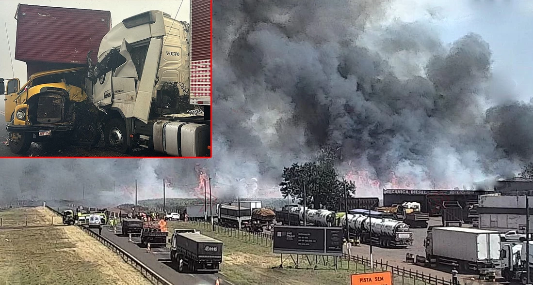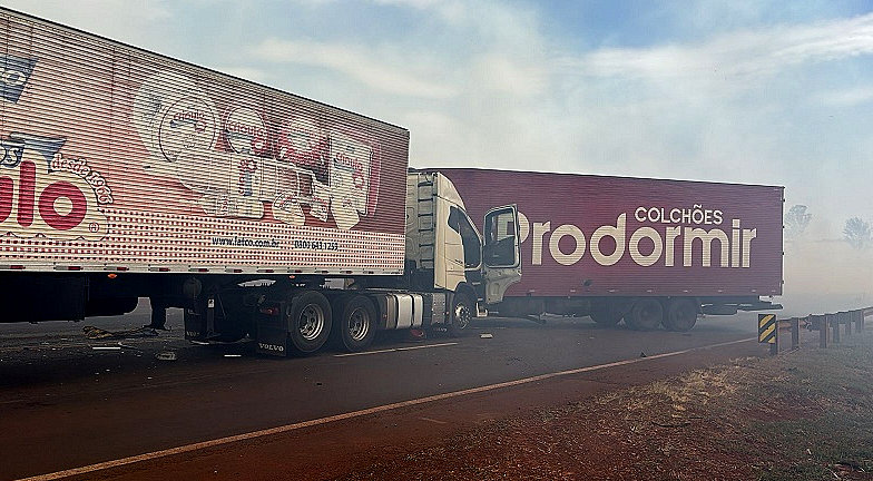 A intensa fumaça reduziu a visibilidade dos motoristas e provocou uma colisão frontal entre um caminhão e uma carreta. De acordo com informações do policiamento rodoviário, há uma vítima em estado grave e outra com ferimentos de natureza leve.