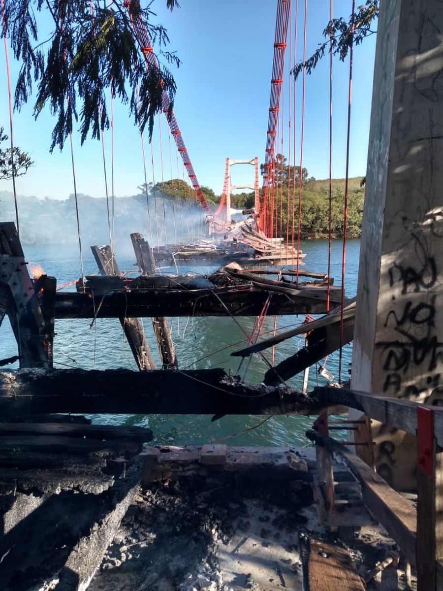 Um incêndio destruiu parte de uma ponte pênsil centenária localizada sobre o Rio Paranapanema, entre os municípios de Chavantes e Ribeirão Claro/PR, no fim da madrugada deste sábado (7).