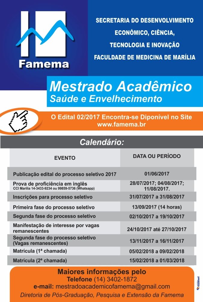 O preenchimento da ficha de inscrição deverá ser feito online, no site www.famema.br/ensino/mestrado_acade/mestrado_inscricao.php. O início das atividades letivas será no dia 02 de março de 2018. Outras informações pelo telefone (14) 3402-1872.